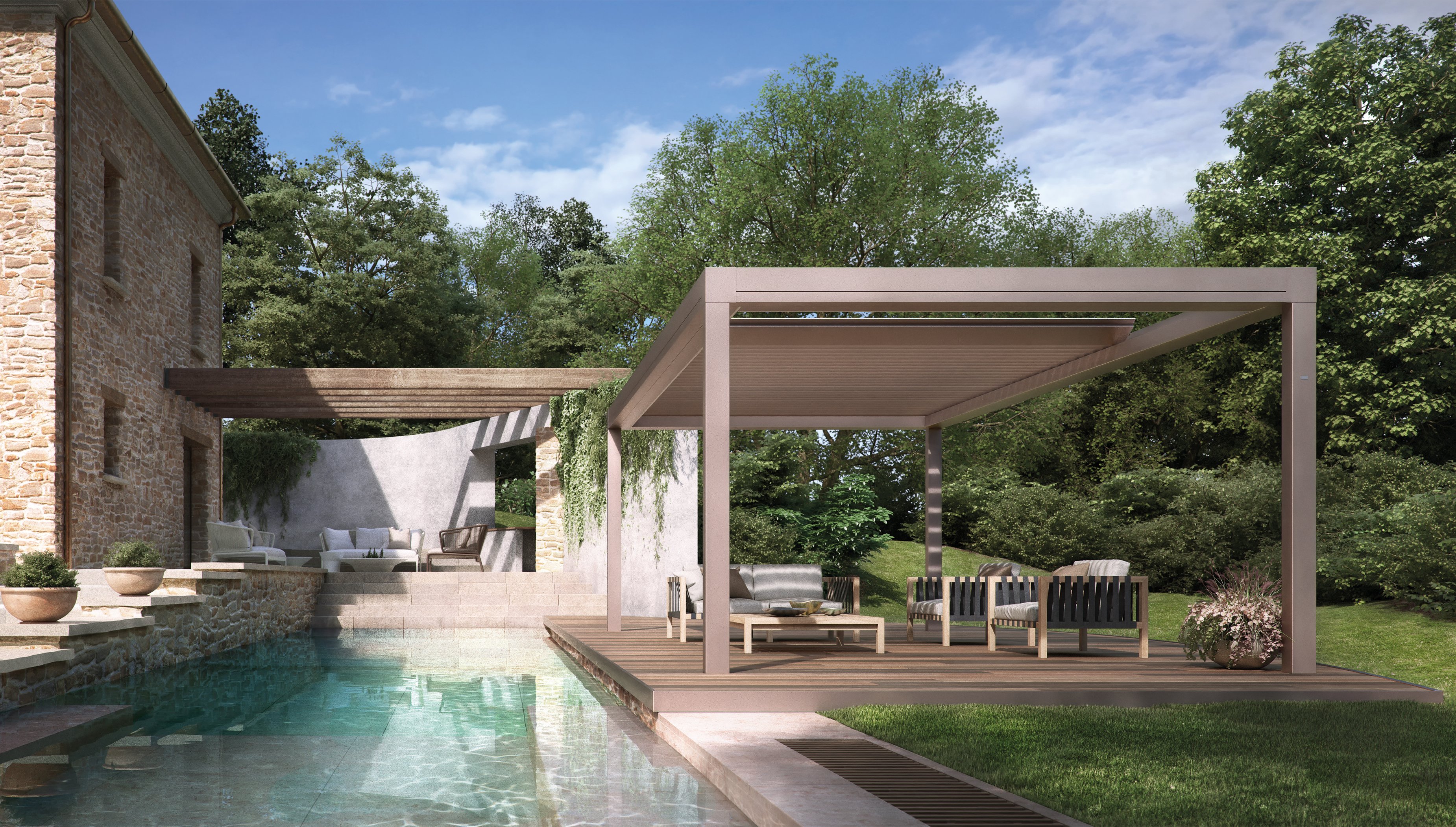 La façon de vivre l'espace extérieur change avec les saisons, pour profiter à tout moment du contact avec la nature et de la lumière du soleil. Brera S est la pergola bioclimatique qui s'ouvre complètement sur le panorama : les lames rétractables prolongent le regard vers le ciel, tandis que la vue sur l'horizon est garantie par les vitrages Glass Series qui offrent une protection totale sur le périmètre. Des compléments d'ameublement sur mesure, des plateformes modulaires, l'éclairage LED et des prises électriques finalisent l'équipement. La frontière entre l'intérieur et l'extérieur est prête à être réimaginée.