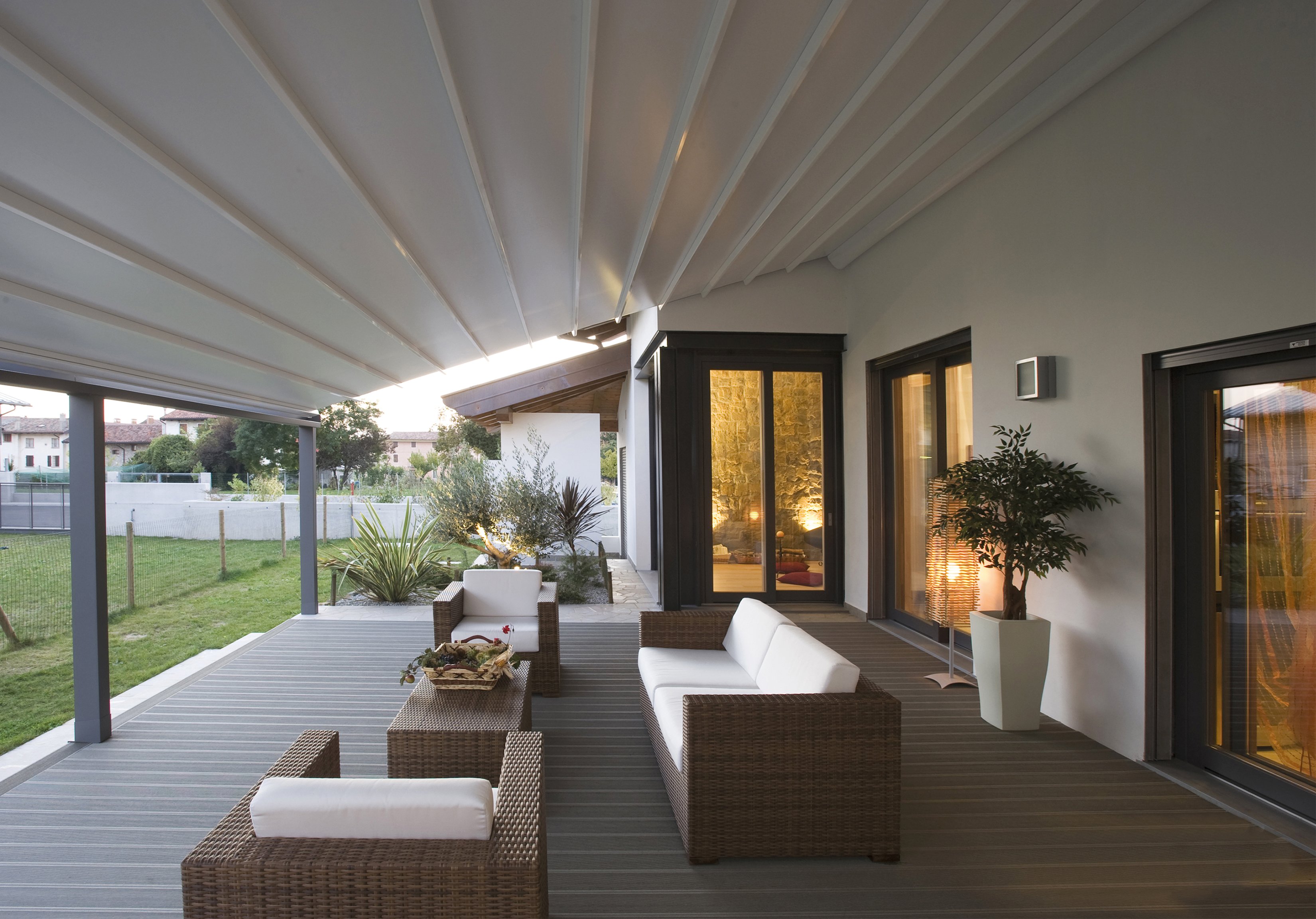 La possibilité de juxtaposer plusieurs modules permet de protéger également les grands espaces extérieurs. La configuration s'adapte parfaitement à la surface de la terrasse, grâce à des modules aux dimensions personnalisables.