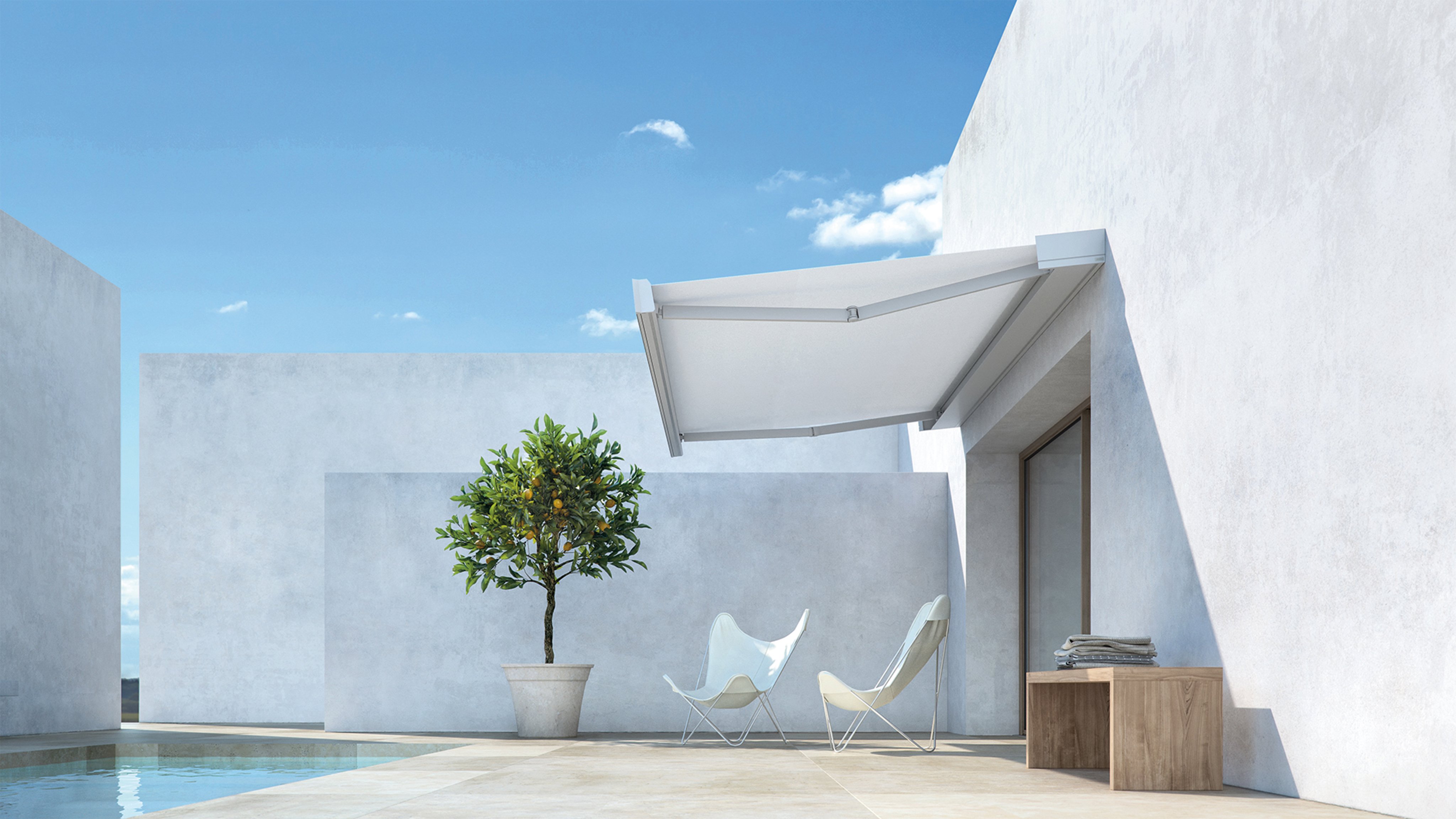 Le store T-Hide atteint une extension maximale de 7 x 4 mètres. Le mouvement des bras et l'activation de l'éclairage dimmable peuvent être confiés à des systèmes domotiques de votre choix. Le caisson en aluminium protège le store lorsqu'il est enroulé et il peut être fixé au mur ou au plafond, avec une inclinaison fixe de 10 à 40 degrés, selon les besoins d'ombrage.